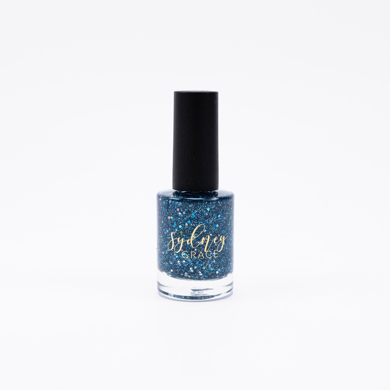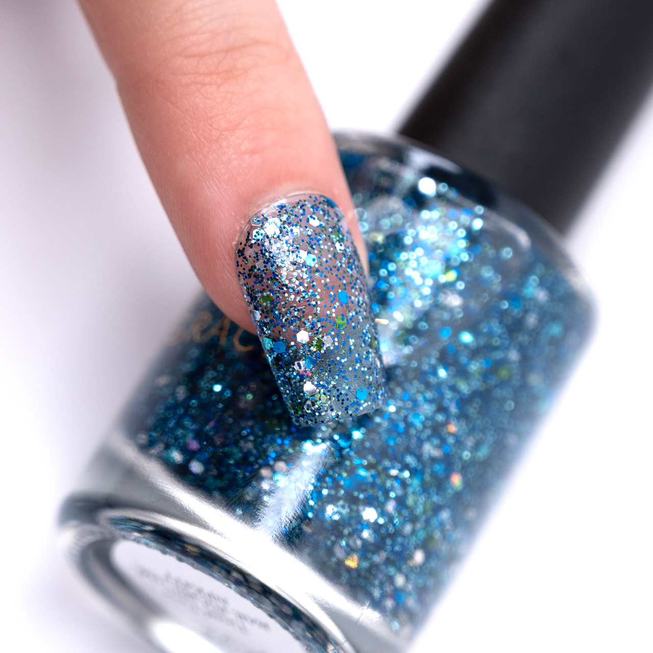 Tinsel Time is a blue polish with a clear base and blue, green, and silver glitter.