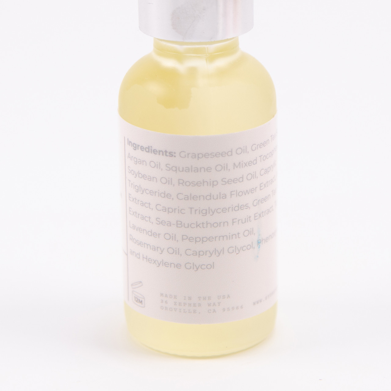 Ingredients: Vitis Vinifera (Grapeseed) Oil, Camellia Oleifera (Green Tea) Seed Oil, Argania Spinosa (Argan) Oil, Squalane Oil, Mixed Tocopherols and Soybean (Glycine Soja) Oil, Rosa Canina (Rosehip) Seed Oil, Caprylic Triglyceride, Calendula Officinalis (Calendula) Flower Extract, Caprylic/Capric Triglyceride, Aloe Barbadensis Leaf Extract, Capric Triglycerides, Camellia Sinensis (Green Tea) Leaf Extract, Capric Triglycerides, Hippophae Rhamnoides (Sea-Buckthorn) Fruit Extract, Melaleuca Alternifolia (Tea Tree) Oil, Lavandula Angustifolia (Lavender) Oil, Mentha Piperita (Peppermint) Oil, Rosmarinus Officinalis (Rosemary) Oil, Caprylyl Glycol, Phenoxyethanol, and Hexylene Glycol